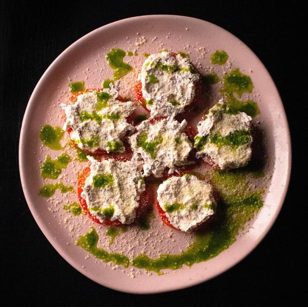 Закуска зі свіжих томатів з начинкою з сиру Фета з бастурмою та часником.